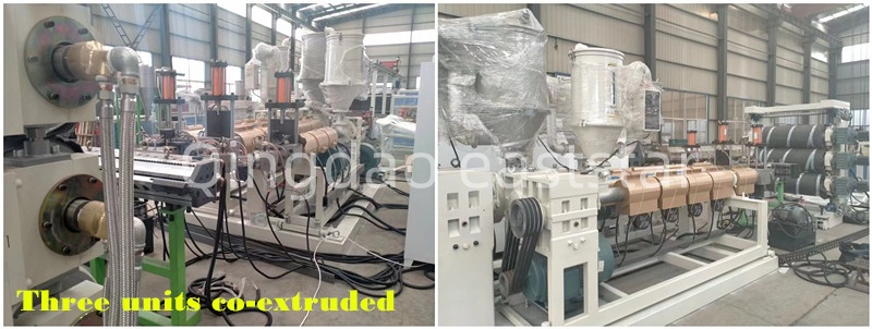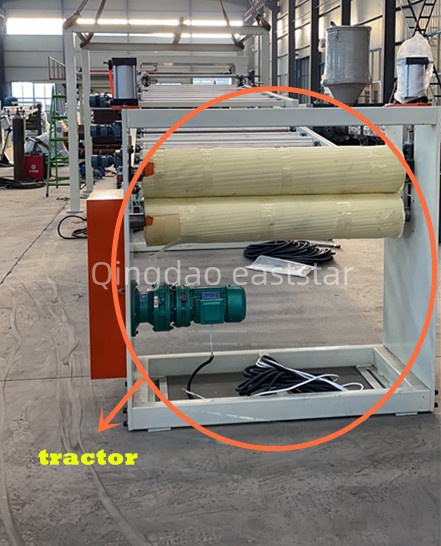 Întregullinie de producție de coextrudare multistratinclude, de asemenea, două schimbătoare hidraulice de ecran, un suport de răcire de 8 metri și un sistem de tăiere prin tracțiune. Schimbătorul de ecrane utilizează componente hidraulice taiwaneze, permițând schimbarea ecranului fără a opri mașina. Mașina de tracțiune este echipată cu role din cauciuc nitril Φ240×2500mm, antrenate de un motor de 2,2KW, realizând reglarea sincronă a vitezei cu cele trei role. Sistemul de control electric al echipamentului de tablă de coextrudare ABS folosește un PLC și un ecran tactil Siemens din seria S7, combinate cu un convertor de frecvență ABB, pentru a asigura funcționarea coordonată a întregii linii.