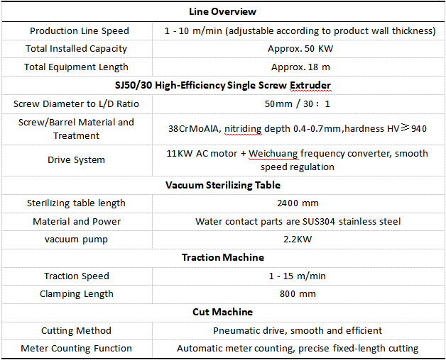 Configurația pentru astalinie de producție a capacului tubului lămpiise concentrează în jurul unor detalii cheie ale echipamentelor. În inima se află extruderul cu un singur șurub SJ50/30. Dispune de un șurub de 50 mm cu un raport lungime/diametru de 30 la 1. Atât șurubul, cât și cilindrul provin din oțel 38CrMoAlA nitrurat, care ajută la topirea completă a materialelor, menține lucrurile uniforme și oferă o ieșire constantă chiar și pentru lucruri dure precum PC, PS și ABS.Linie de producție a capacului tubului lămpiiîmperechează un motor AC de 11 kW cu un convertor de frecvență Weichuang, astfel încât viteza să rămână sub control precis. În plus, un alimentator automat cu vid și uscător cu dezumidificator are grijă de umiditatea din materiile prime precum PC-ul și ABS, asigurându-se că topitura rămâne de înaltă calitate pentru procesul de extrudare. Întreaga linie primește control central prin piese de joasă tensiune Siemens și controlere de temperatură Omron, care mențin totul să funcționeze în mod fiabil.