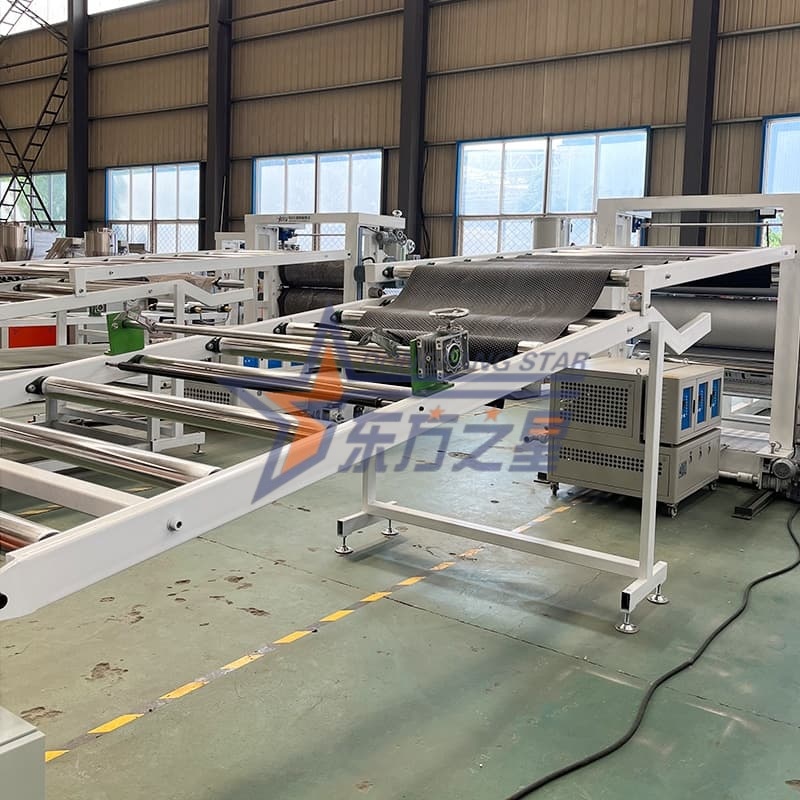 TheLinie de producție de foi de covoraș TPE anti-alunecarefolosește o matriță cu canal de curgere cu finisaj în oglindă de tip MJ-1160 și un calandru cu trei role SG-1200 pentru o funcționare precisă. Canalul de curgere a matriței este cromat și lustruit pentru a asigura o distribuție uniformă a topiturii. Calandrul folosește role cu finisaj în oglindă de φ400mm cu o rugozitate a suprafeței de Ra≤0,025μm. Reglează cu precizie temperatura rolei printr-un sistem independent de control al temperaturii.