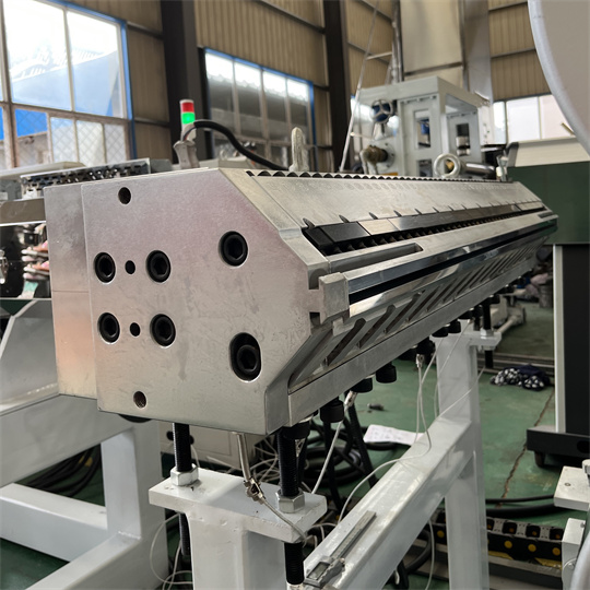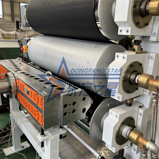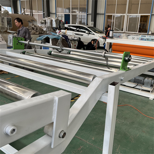 Echipament de placă antistatică din PVC: Echipamentul constă în principal dintr-un extruder cu un singur șurub 120, un calandru cu trei role, un suport de răcire, o mașină de tracțiune cu role de cauciuc, o mașină de forfecare și un dispozitiv cu bandă transportoare. Lățimea standard a echipamentului pentru panoul din spate al broaștei testoase din PVC este de 1000 mm. Grosimea este de 6 mm. Echipamentele de extrudare din PVC antistatice pot produce diverse texturi, cum ar fi modelul de broasca testoasa, modelul de coaja de portocala si modelul in carouri. Echipamentele din PVC pentru plăci țestoase pot fi procesate și personalizate în funcție de cerințele clienților.