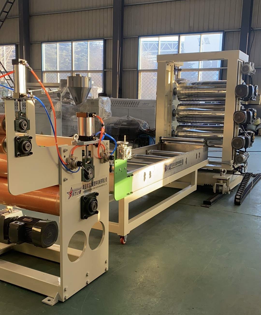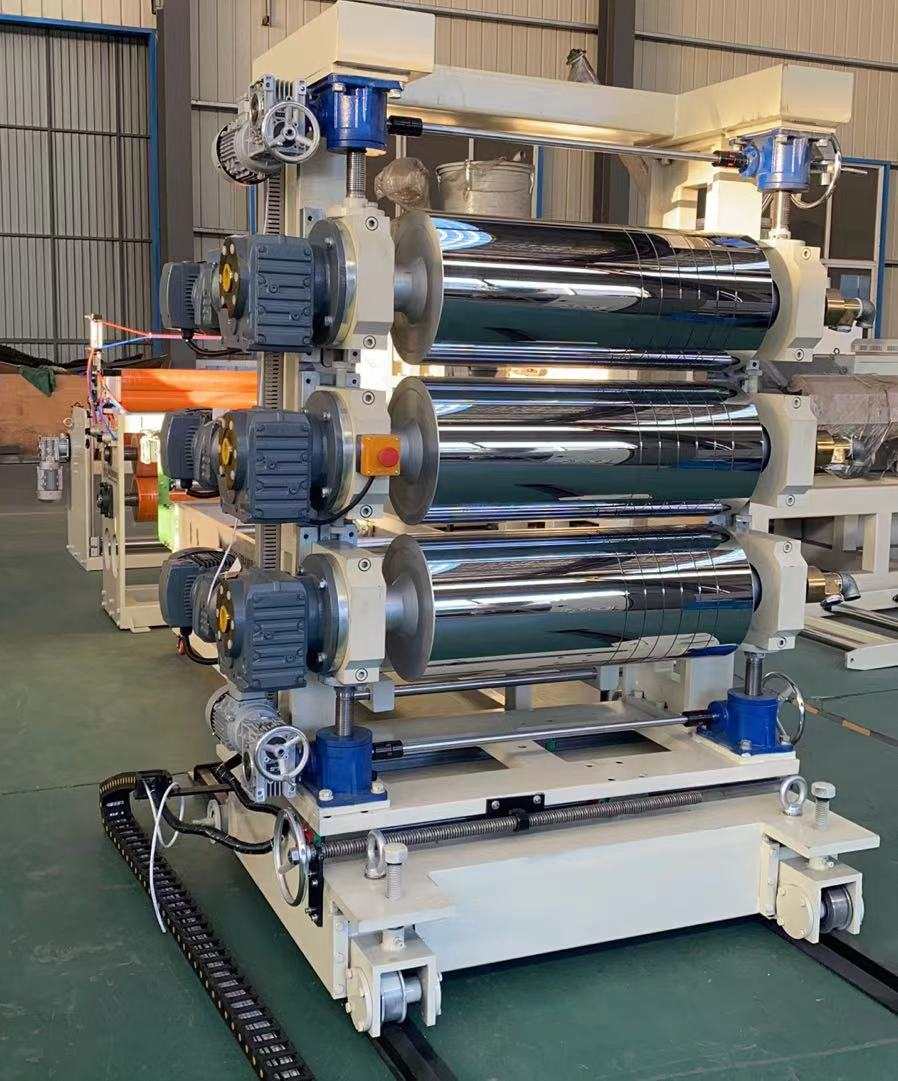 Linie de producție pentru draperii moi transparente din PVC: capabilă să producă foi de plastic transparent din PVC cu o lățime cuprinsă între 200 și 600 de milimetri și o grosime de 0,8 până la 3 milimetri. Echipamentul include un extruder cu un singur șurub SJ90 sau SJ-120, o matriță flexibilă reglabilă în formă de T, un calandru cu trei role vertical sau înclinat la 45 de grade, un regulator de temperatură a apei trei în unu, un suport de răcire din oțel inoxidabil echipat cu un cuțit de tăiat reglabil pe lățime largă, o mașină de tracțiune și aer de aer și role de cauciuc. Foile produse au o suprafață lucioasă, transparență ridicată, moliciune, fără crăpături, fără miros, fără bule și sunt flexibile, rezistente la frig, rezistente la uzură, rezistente la acid-alcali și rezistente la coroziune.