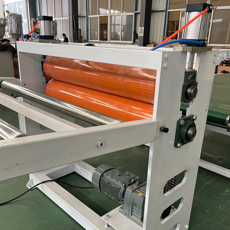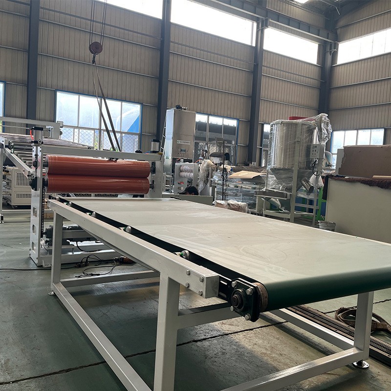 Linie de producție a extruderului cu folii transparente din PVC: echipamentul constă în principal dintr-un extruder cu două șuruburi, o matriță cu plăci, un calandru cu trei role, un suport de răcire, o mașină de tracțiune cu role de cauciuc, o mașină de tăiat.